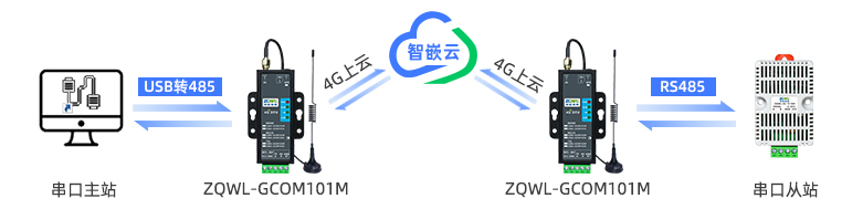 下面演示以一对一透传为例,讲解如何通过一对网关搭配智嵌云实现数据透明传输,从一端的串口直接读到远端的串口设备的数据,并演示如何接线与配置,通讯网关选择智嵌物联的的ZQWL-GCOM101M,串口设备选择智嵌物联的传感器ZQWL-SS-1C10H。