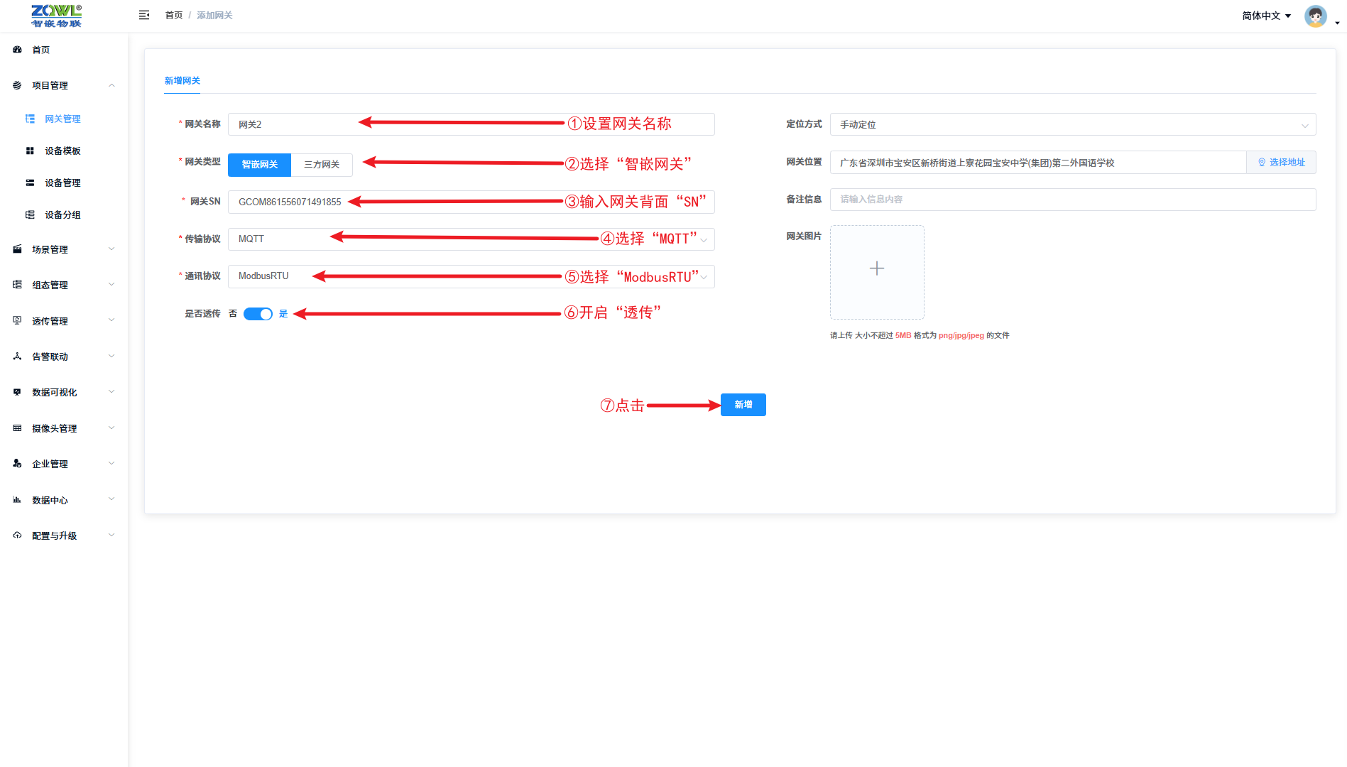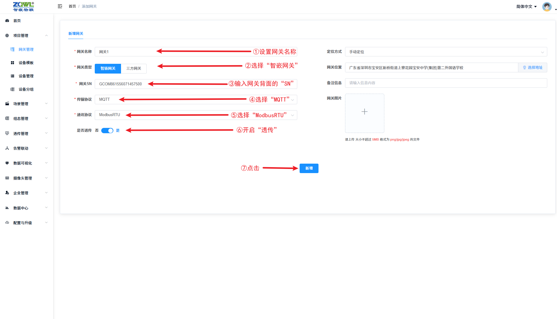 ●填写网关基本信息,按需填写网关位置、备注信息、网关图片。