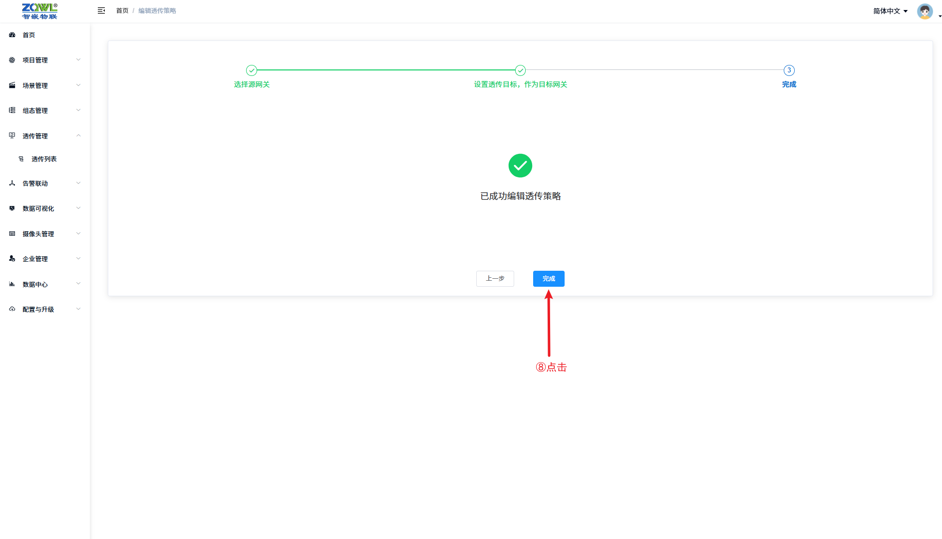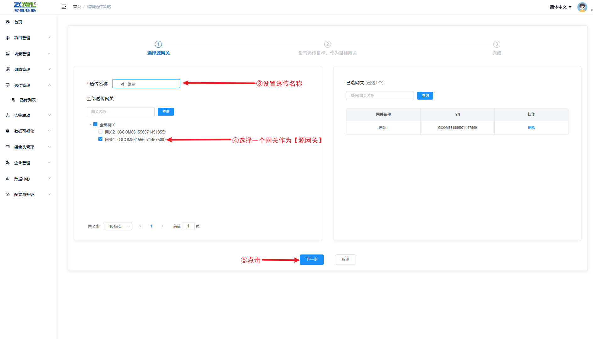 2、给透传设置名称,并选择一个网关作为【源网关】