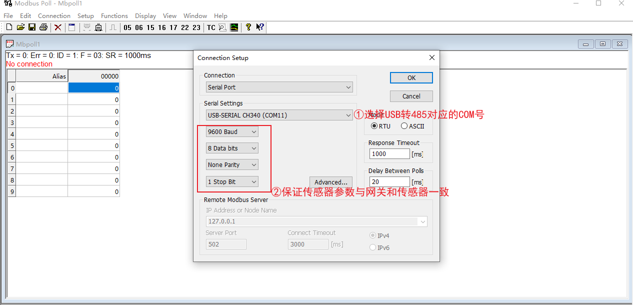 注意:要实现能够通讯的前提是,网关、传感器、USB转485线的串口参数都要一致,串口参数有(波特率、数据位。停止位、校验位)