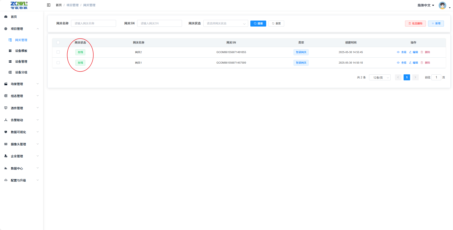 ●确保网关是上电且已插入SIM卡的情况下,在网关管理列表,能看见两个网关已在线,此时网关就已经添加成功了