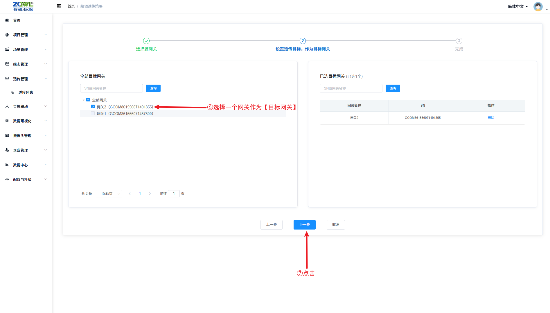 2、给透传设置名称,并选择一个网关作为【源网关】
